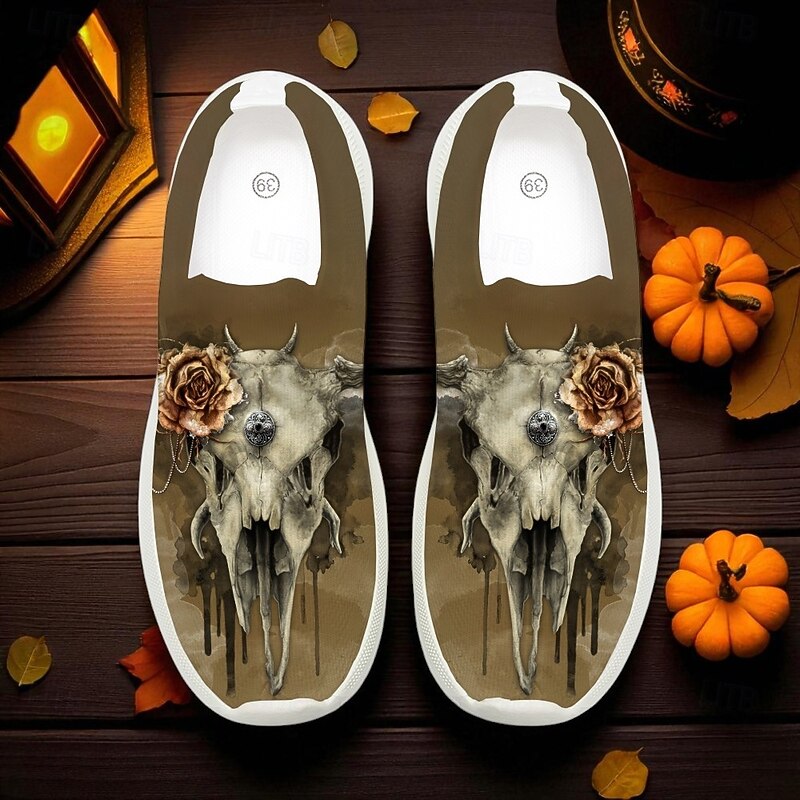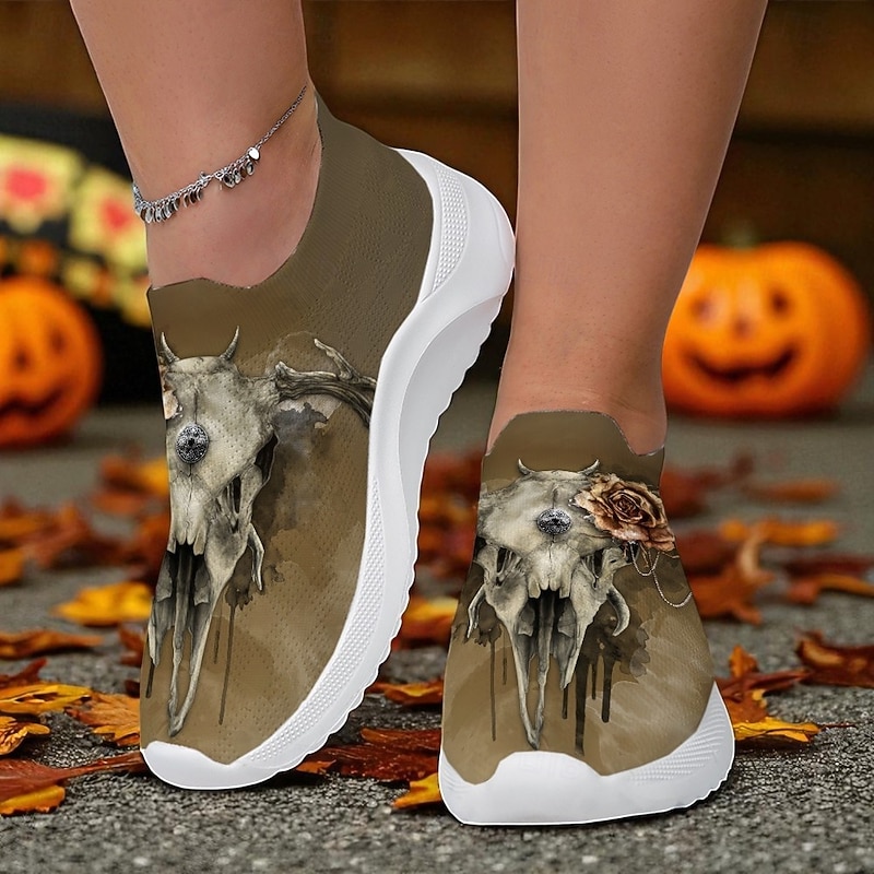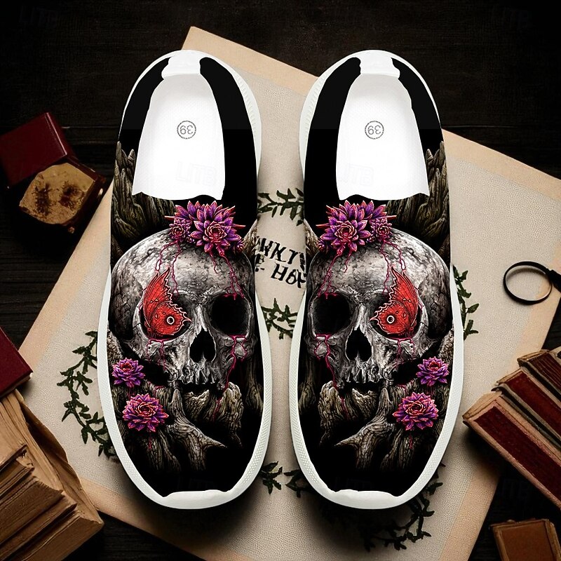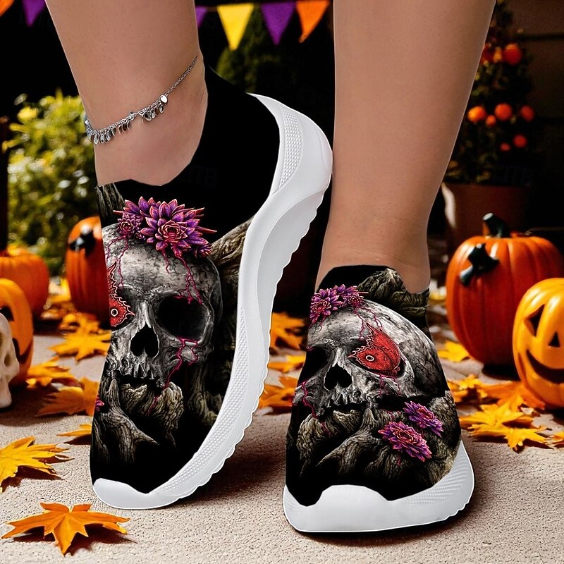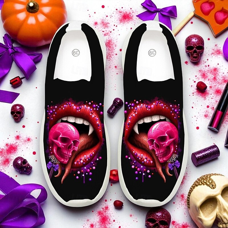 Women's Halloween Slip-On Sneakers – Black Flyknit Comfort Shoes with Vampire Lips and Skull Print for Costume Parties, Trick-or-Treating and Casual Fall Wear Sarah Richter 11