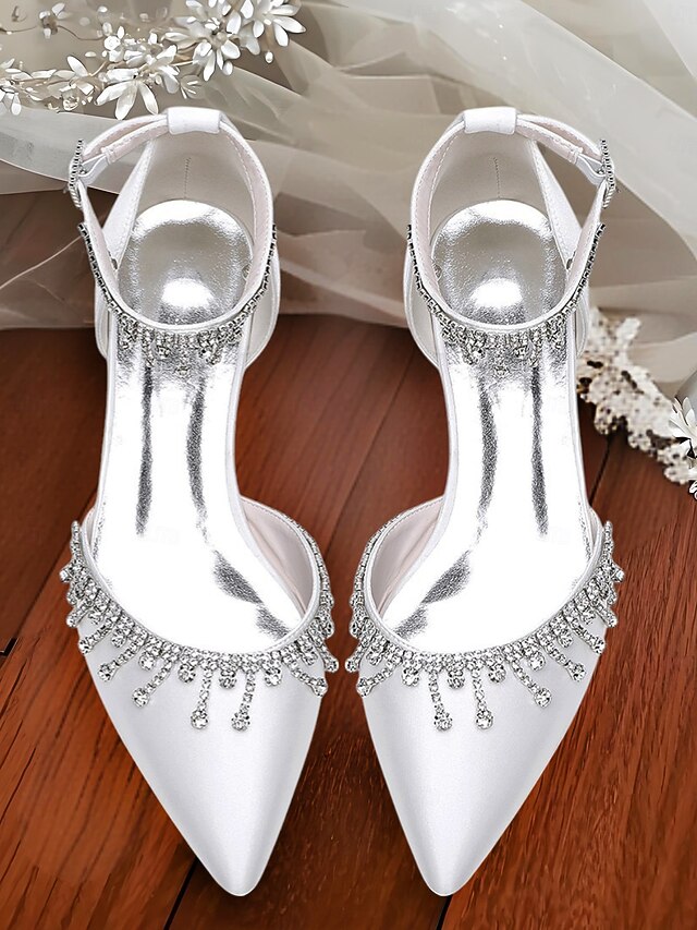 HOT ! Women's White Satin Ankle Strap Wedding Heels – Pointed Toe Bridal Shoes with Crystal Drop Detail
