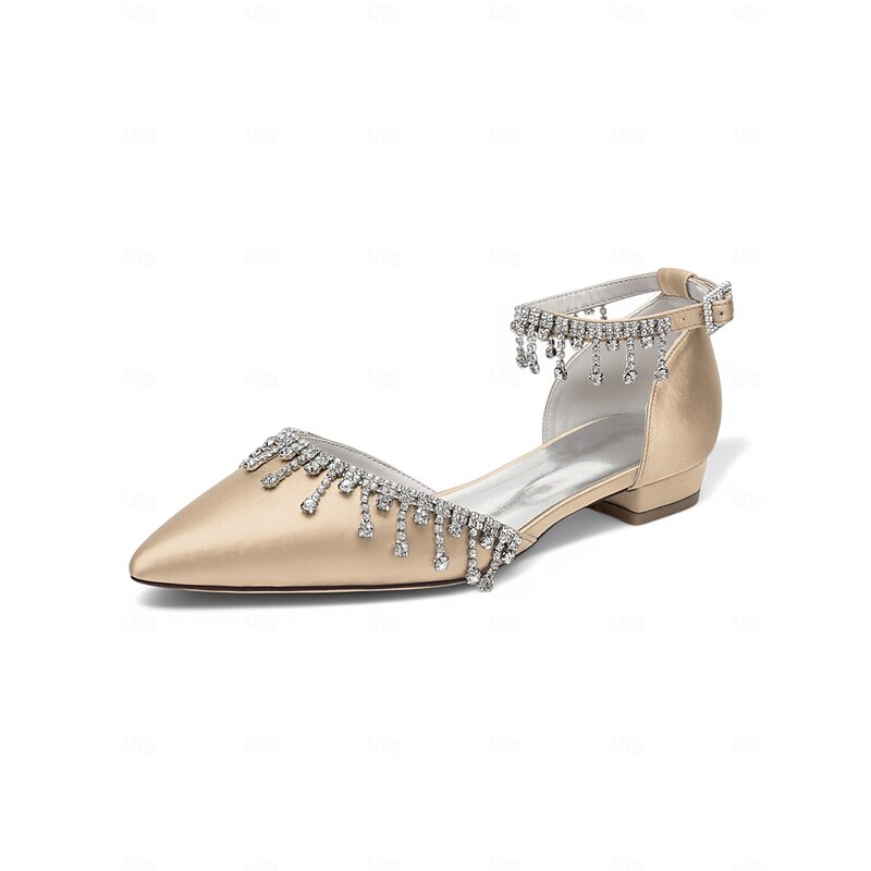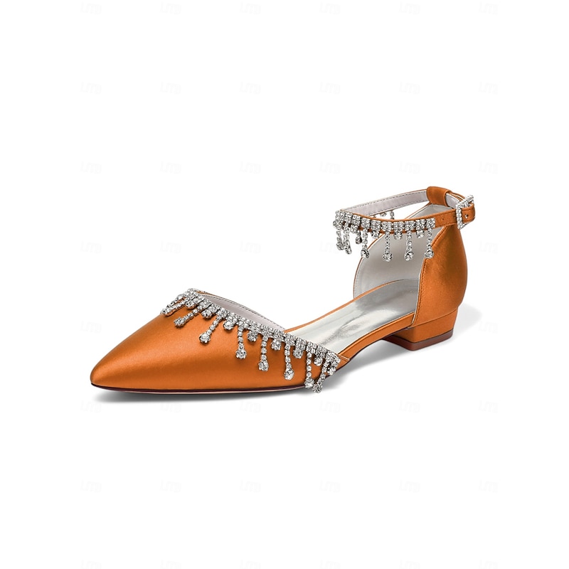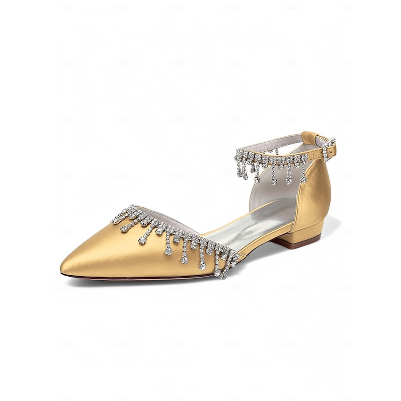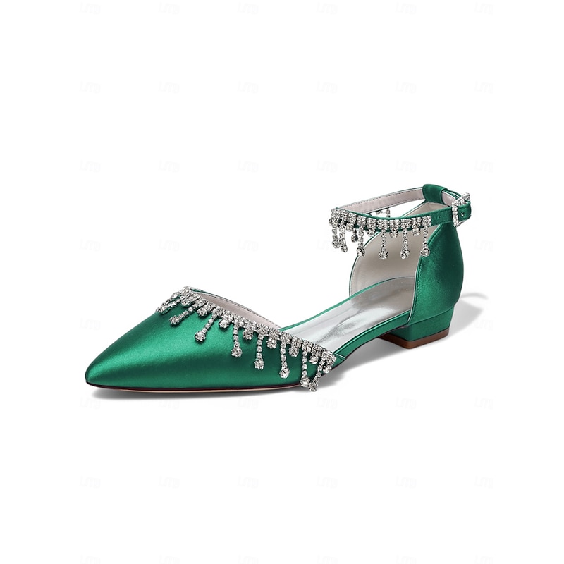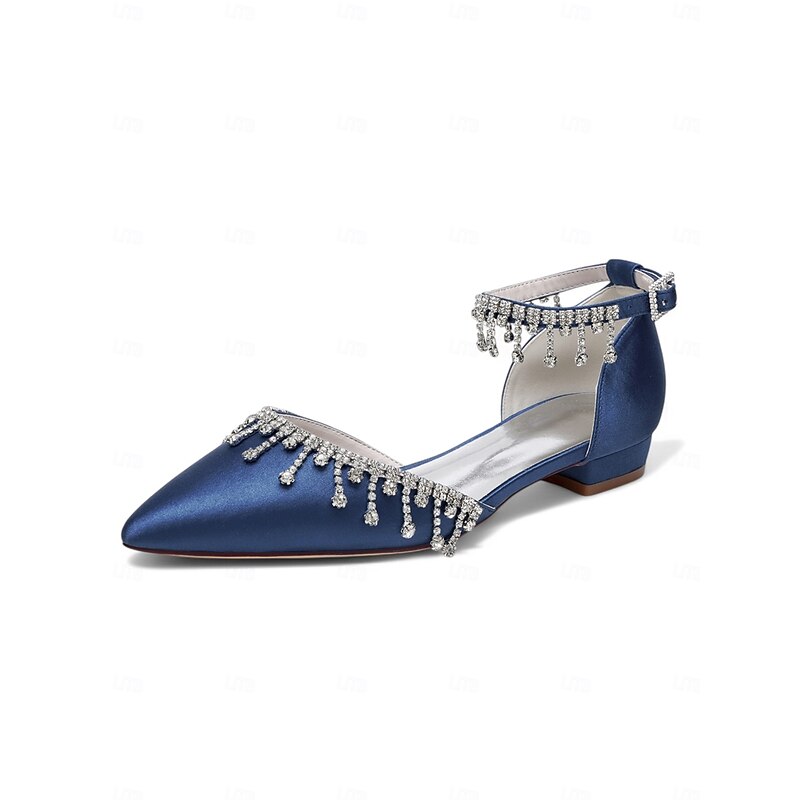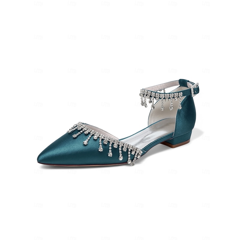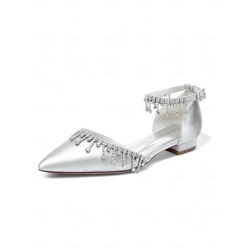 Highlights - Luxurious satin upper material - Sparkling rhinestone embellishment - Elegant pointed toe shape - Durable rubber outsole.