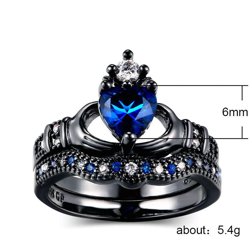 2in1 Retro Black Halo Created Blue Sapphire Cubic Zirconia Wedding Engagement Eternity Heart Hand Rings Set Women's Band Vintage for Bridal Mom Lover