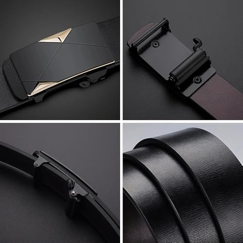 Men's Leather Ratchet Belt, Automatic Slide Buckle, Black, Adjustable Fit 7