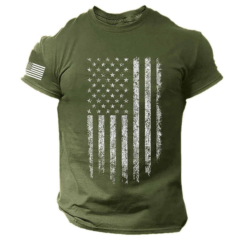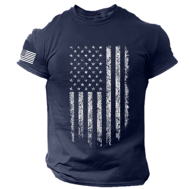Highlights [Fabric & Feel:] Crafted from 100% cotton, our Men's National Flag T-shirt offers a soft, breathable, and durable fabric, making it ideal for summer wear. The micro-elasticity of the material ensures a comfortable and flexible fit throughout the day. [Fit & Style:] This classic and casual T-shirt has a regular fit with a standard crew neck and short sleeves, providing a relaxed and laid-back silhouette perfect for daily wear, whether you're heading to a casual outing or running errands. [Design Highlights:] Featuring a bold print of the American flag with a vintage distressed effect, this T-shirt combines fashion with a touch of patriotism. The unique addition of a small American flag patch on the right sleeve elevates its style and appeal. [Versatile Occasions:] Designed for sports, outdoor activities, holidays, and more, this T-shirt is a versatile piece for various settings. Whether you're enjoying a day out in the sun or celebrating a national event, it's a stylish choice that conveys pride and comfort. [Size Availability:] Available in a wide range of sizes from S to XXL, this T-shirt caters to adults of all age groups. Its regular fit makes it suitable for a variety of body types, ensuring everyone can express their national pride with style and ease.