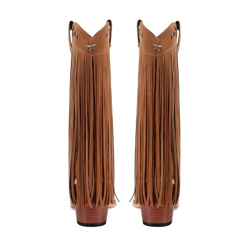Fringe Cowboy Boots for Women Pull on Mid Calf Cowgirl Boots with Star Studded Pointed Toe and Chunky Heel Western Boots 7