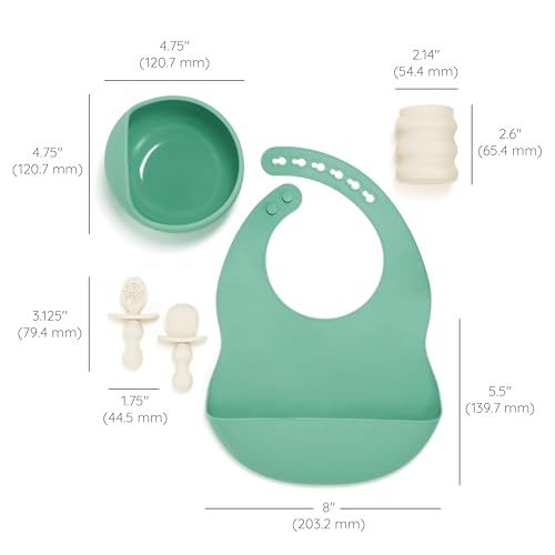 Infantino Baby Led Weaning Kit, 5-Piece Essentials Set - Includes Silicone Bib, Suction Bowl, Training Cup & Spoons, BPA-Free & Top-Rack Dishwasher Safe, Cream & Spearmint 5