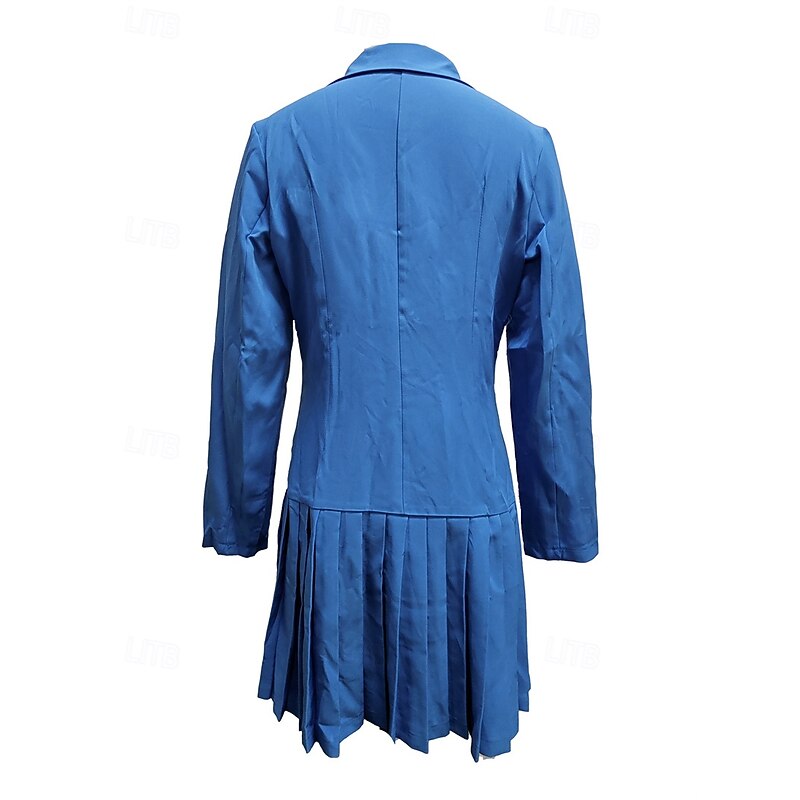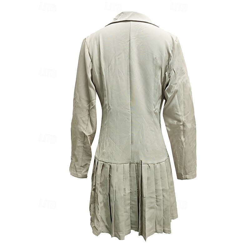 : This mini dress features a stylish pleated skirt and a double-breasted closure with striking silver buttons, exuding a chic and tailored look. The elegant V-neckline and long sleeves add a modern touch to its timeless appeal, making it a versatile piece for any wardrobe.