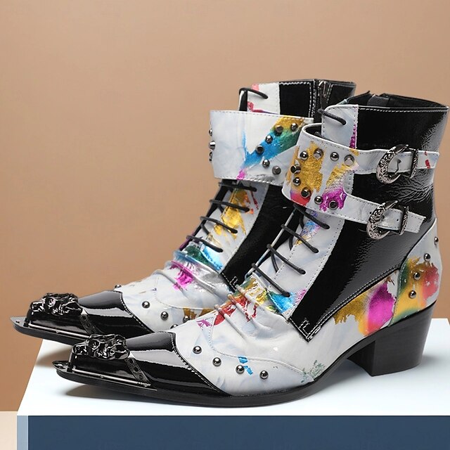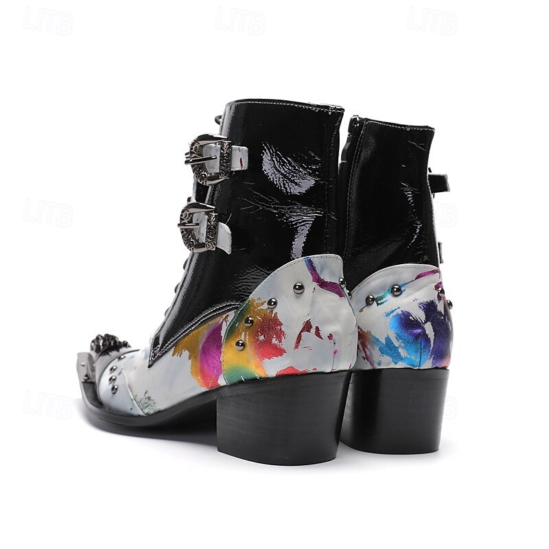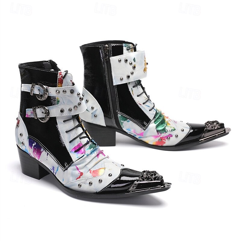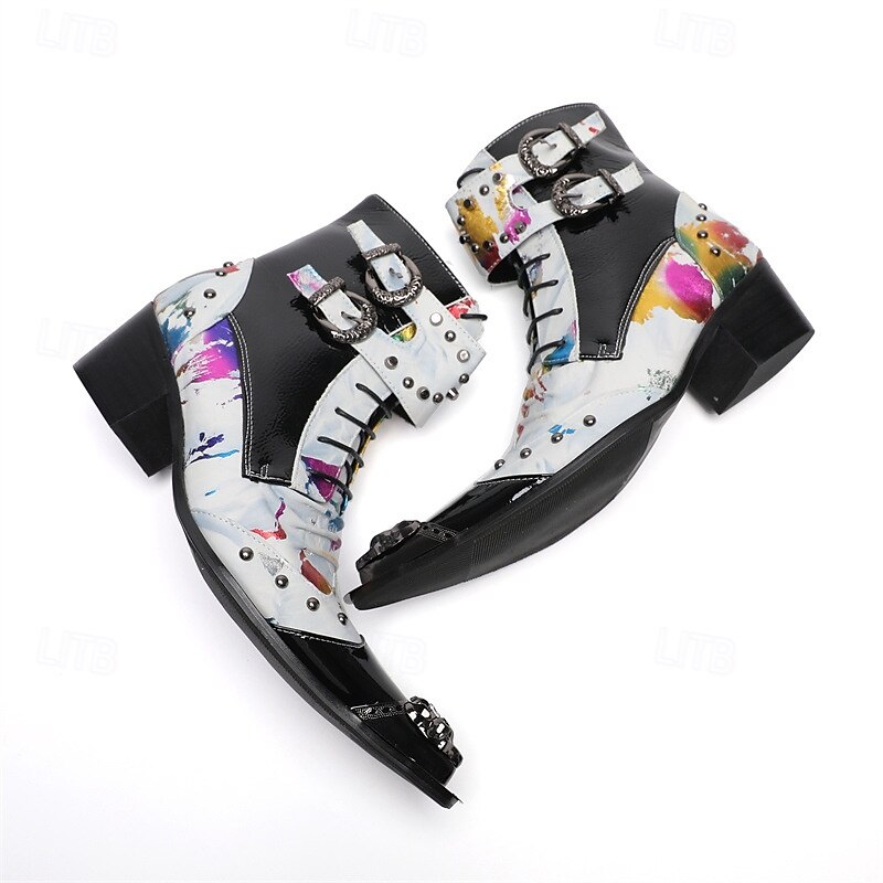 More information about Men's White Genuine Leather Punk Ankle Boots with Graffiti Print and Double Buckle Straps, 100% Cowhide Lace-Up Western Boots for Stage, Parties and Cosplay Events