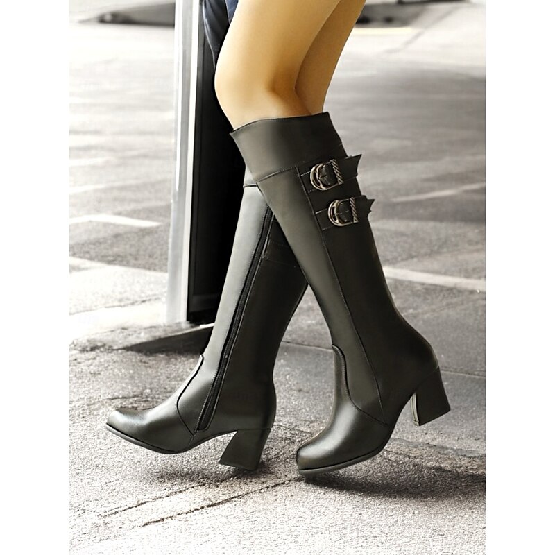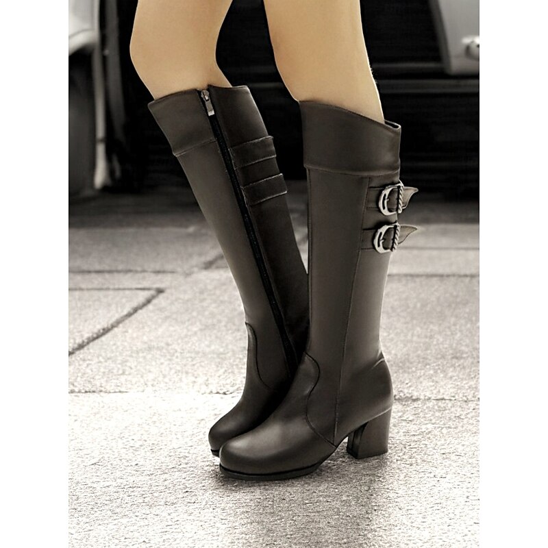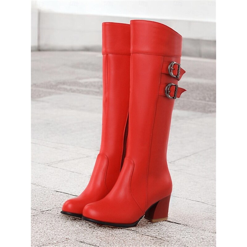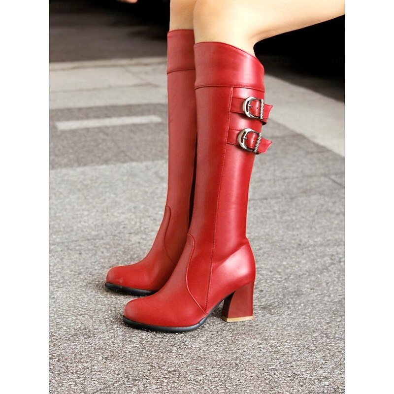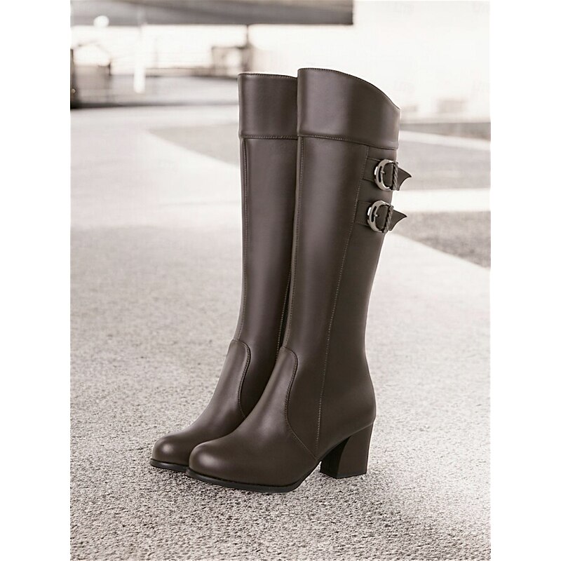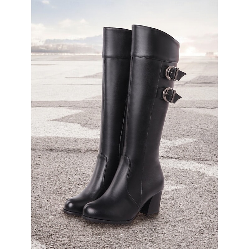Highlights [Fabric] These women's knee-high boots are crafted from high-quality PU material, providing a sophisticated and polished appearance suitable for various seasons, including spring, summer, fall, and winter. [Fit] Featuring a stylish block heel and a classic round toe, these boots offer both height and comfort, making them perfect for all-day wear. The standard sizing ensures a comfortable fit—simply select your usual size. [Design Highlights] The standout design includes a dual buckle detail on the upper side, adding a touch of edginess and sophistication to your look. The convenient inside zipper allows for easy wearing and removal while maintaining the boot's sleek design. [Occasions] Versatile and chic, these boots are a perfect fit for both casual and formal occasions. Pair them with dresses, skirts, or skinny jeans for a stylish ensemble. Ideal for daily wear, they are a must-have addition to any fashion-forward wardrobe. [Size Range] Available in a wide range of sizes, from US5.5 / EU35 / UK3.5 to US10.5 / EU42 / UK8.5, ensuring a perfect fit for every fashionista.