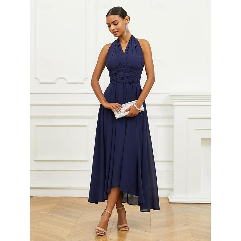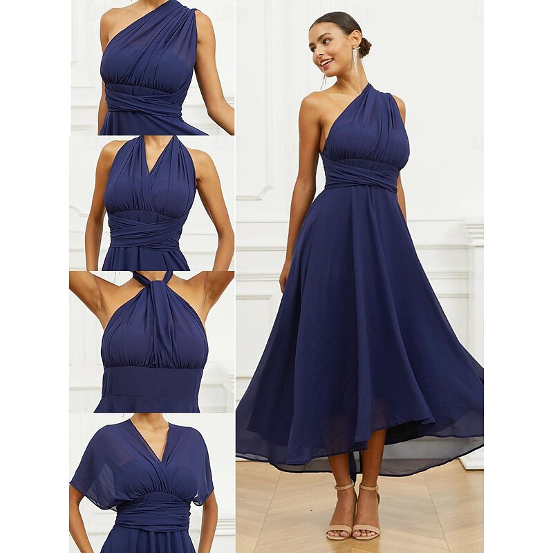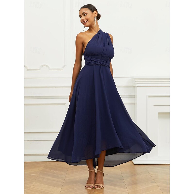 HOT ! Women's Wedding Guest Cocktail Dress A Line Midi Chiffon Ruched Belted Elegant Formal One Shoulder Sleeveless Dress Navy Blue Color