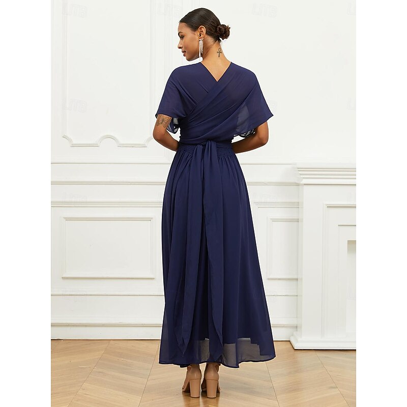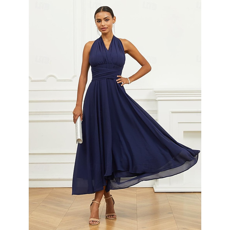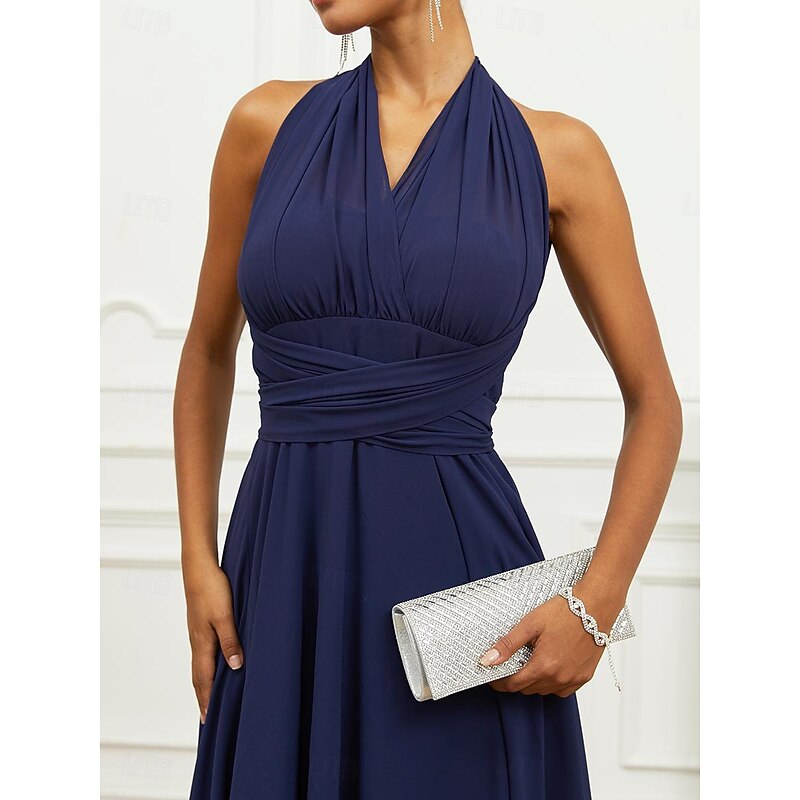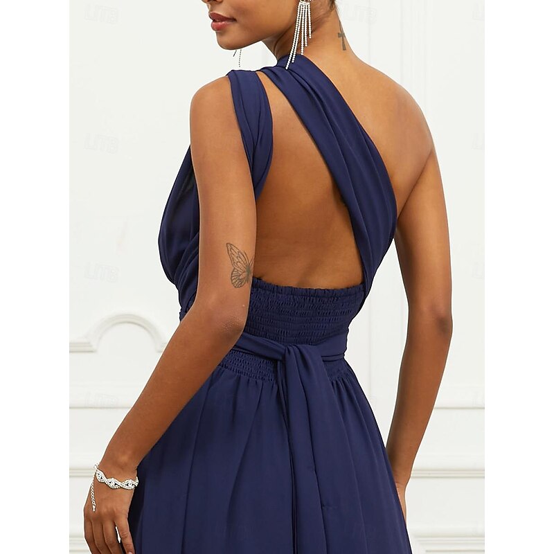 More information about Women's Wedding Guest Cocktail Dress A Line Midi Chiffon Ruched Belted Elegant Formal One Shoulder Sleeveless Dress Navy Blue Color