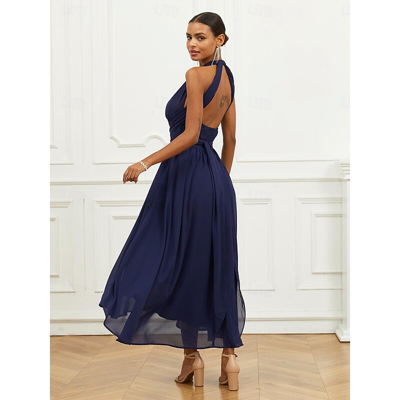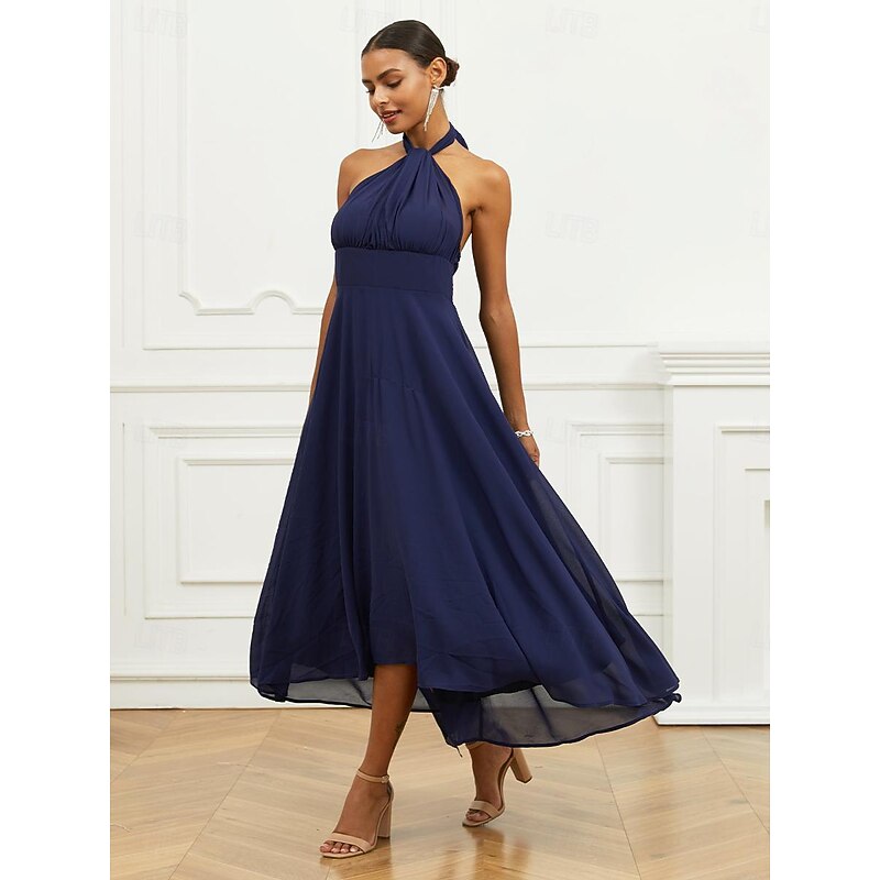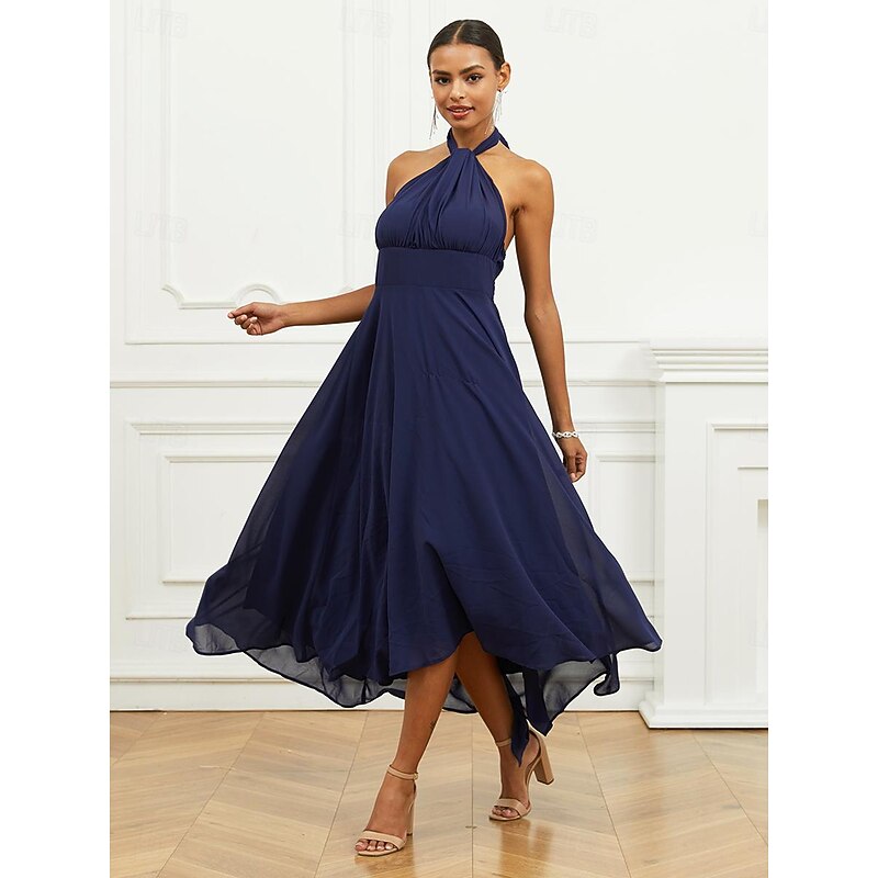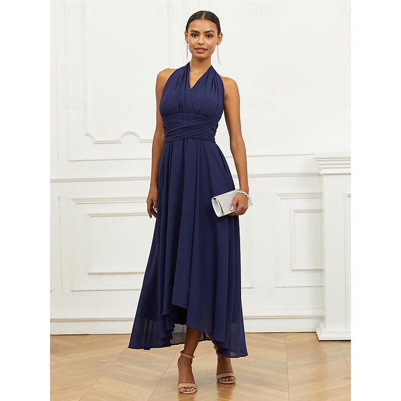Women's Wedding Guest Cocktail Dress A Line Midi Chiffon Ruched Belted Elegant Formal One Shoulder Sleeveless Dress Navy Blue Color 20