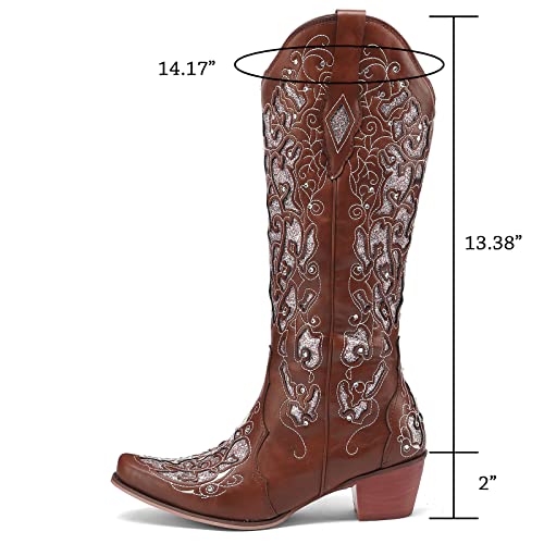 Kluolandi Cowboy Boots for Women Wide Calf Western Knee High Boots with Rhinestone Chunky Heel Embroidered Cowgirl Boots 6
