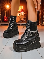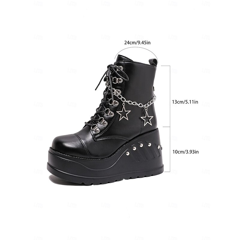 More information about Women's Black Platform Punk Rock Biker Boots - Faux Leather Lace-Up Wedge Heels with Star Chain for Concerts, Nightlife and Y2K Street Fashion