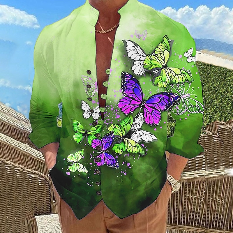 Highlights [Fabric]: Made from a lightweight and breathable polyester blend, this men's shirt offers both comfort and flexibility, perfect for staying cool during warm weather. [Fit]: With a regular fit, this shirt maintains a casual and relaxed silhouette. The long sleeves and stand collar add a touch of sophistication, while the button-down front ensures ease of wear. [Design Highlights]: Featuring a captivating butterfly print, this shirt showcases a gradient effect transitioning from soft sky blue to deep navy. The vibrant butterfly motifs in shades of blue, orange, and white create a bold and artistic statement, making it an eye-catching piece in any wardrobe. [Occasions]: Ideal for vacations, street outings, casual daily wear, and outdoor events, this shirt is a versatile choice for various settings. Whether you're going out for a casual day or attending a summer gathering, it provides a stylish and relaxed look. [Size Range]: Available in sizes S, M, L, XL, 2XL, and 3XL, this shirt caters to a wide range of body types, ensuring a suitable fit for everyone.