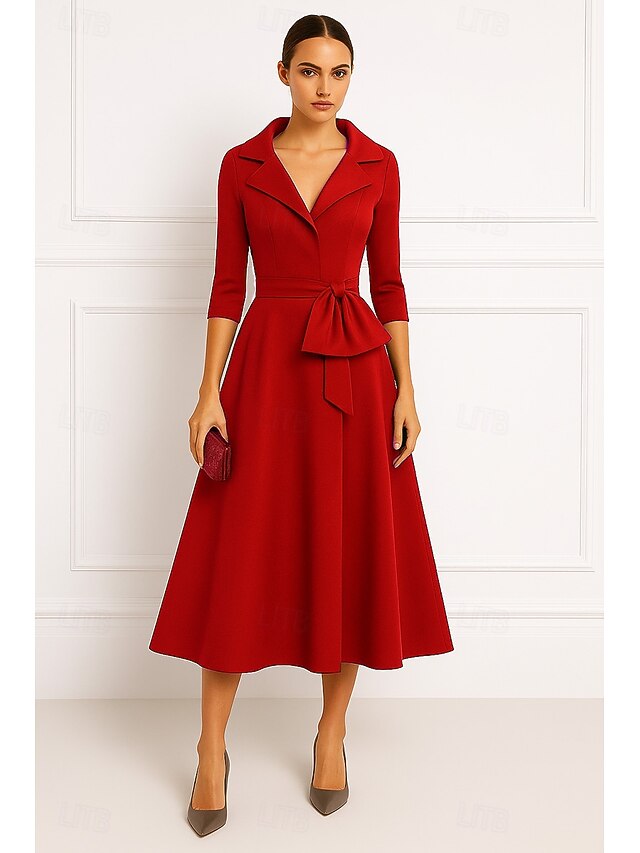 More information about Red Portrait Collar A-Line Cocktail Dresses Elegant Dress Formal Wedding Tea Length Midi Length 3/4 Length Sleeve Stretch Crepe with Bow(s) 2025