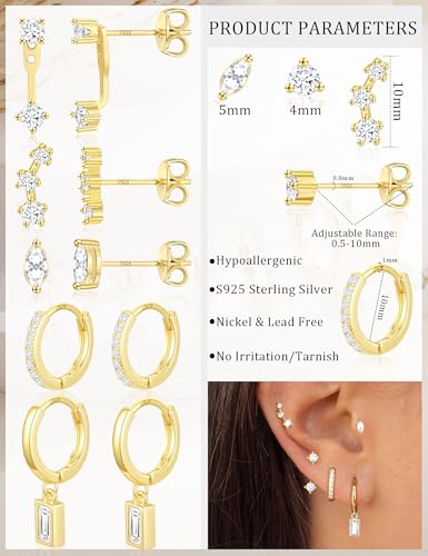 5 Pairs Gold Hoop Earrings 925 Sterling Silver 14K Gold Plated Stud Earrings for Women Hypoallergenic Cartilage Earrings Set for Multiple Piercing Small Huggie Dangle Earring Stack Jewelry Gift 6