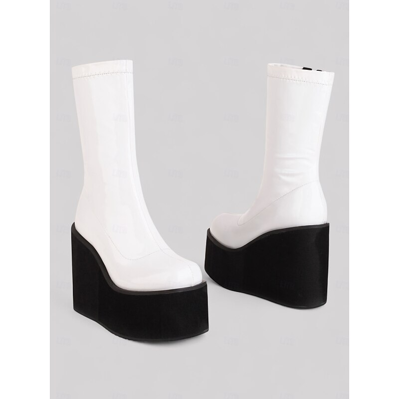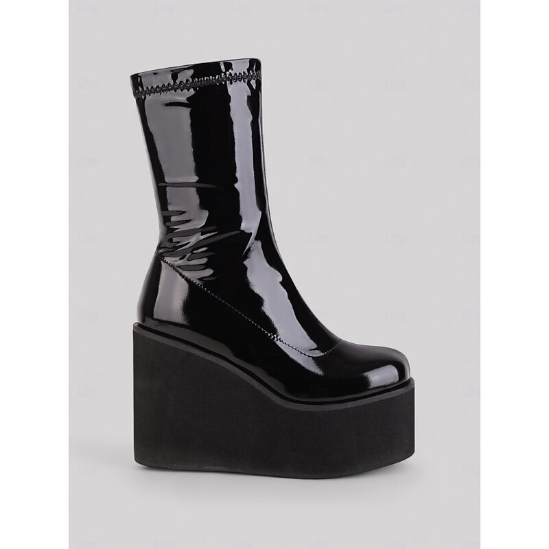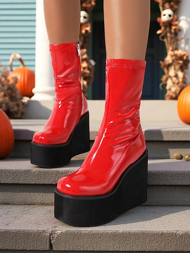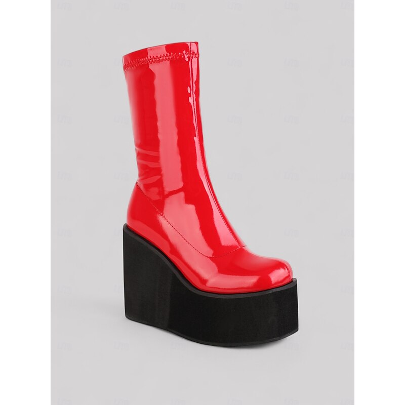 Women's 1980s Red Patent Platform Wedge Go-Go Boots – Retro Shiny Ankle Boots for Parties, Stage Shows, and Halloween Costumes 19