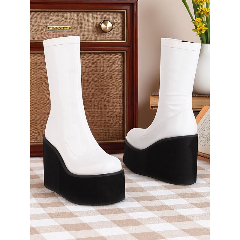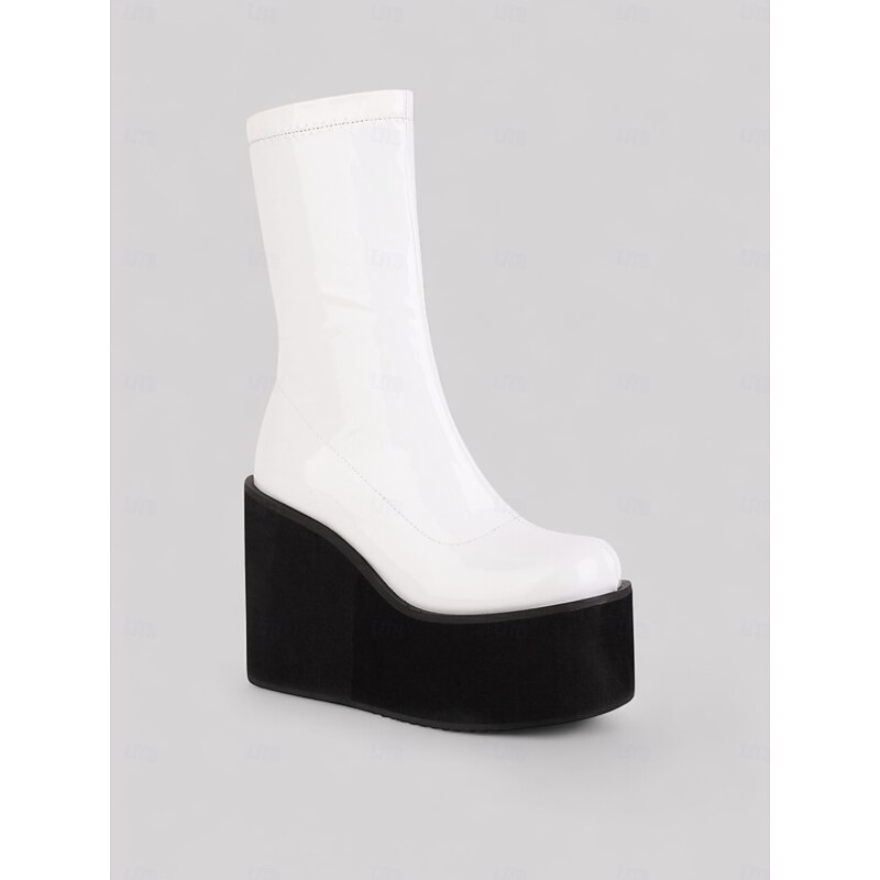 HOT ! Women's 1980s Red Patent Platform Wedge Go-Go Boots – Retro Shiny Ankle Boots for Parties, Stage Shows, and Halloween Costumes