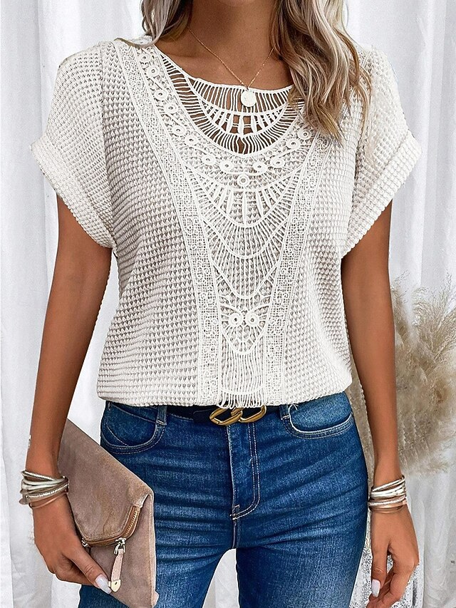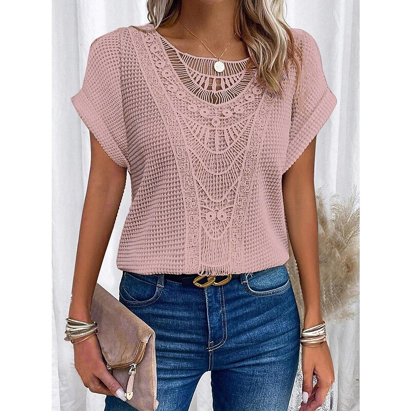 Women's T Shirt Solid Color Elegant Stylish Short Sleeve Crew Neck Daily Beach Hollow Out Pink Blue Beige Summer 9