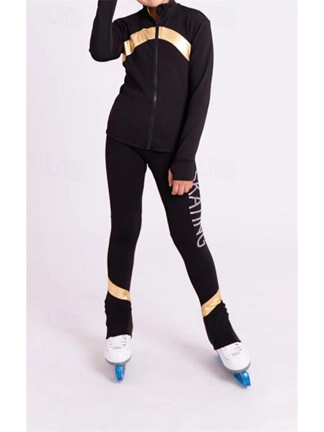 HOT ! Figure Skating Fleece Jacket Figure Skating Pants Figure Skating Jacket with Pants Women's Girls' Ice Skating Jacket Tights Outfits Black Dark Blue Patchwork Thumbhole Spandex Stretchy Training