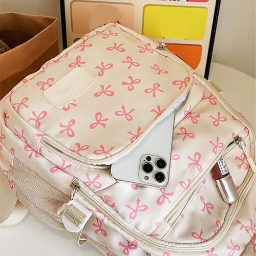 3Pcs Set Bow Backpack for Girls, Cute Kawaii Large Capacity Nylon Rucksack With Bow Pattern for preppy (White Pink) 5