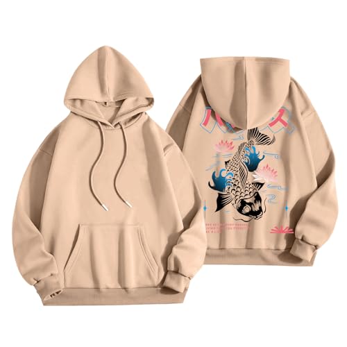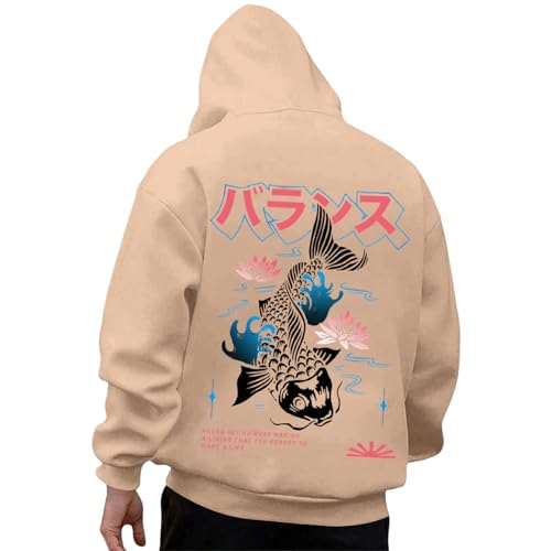 HOT ! Men's Graphic Hoodies Oversized Drawstring Japanese Koi Fish Printed Sweatshirts Fall Long Sleeve Streetwear Pullover Tops