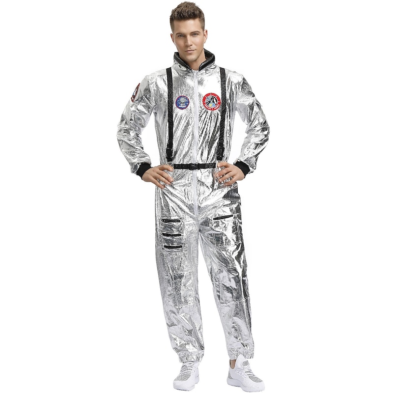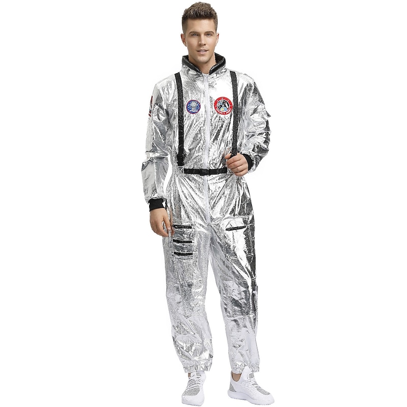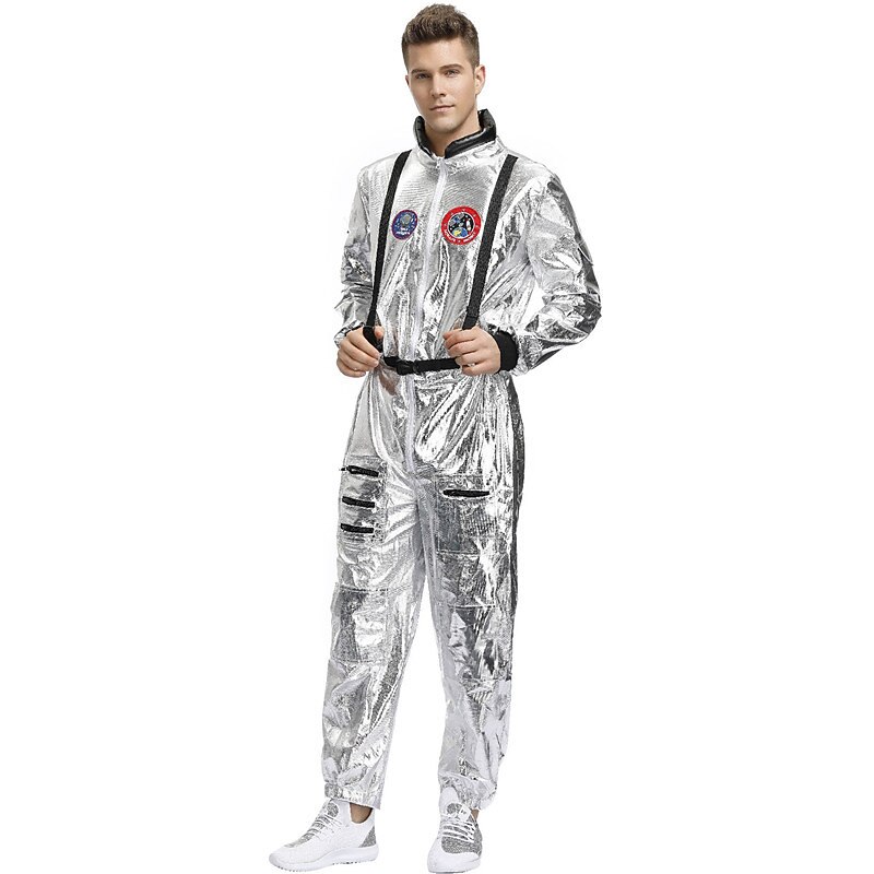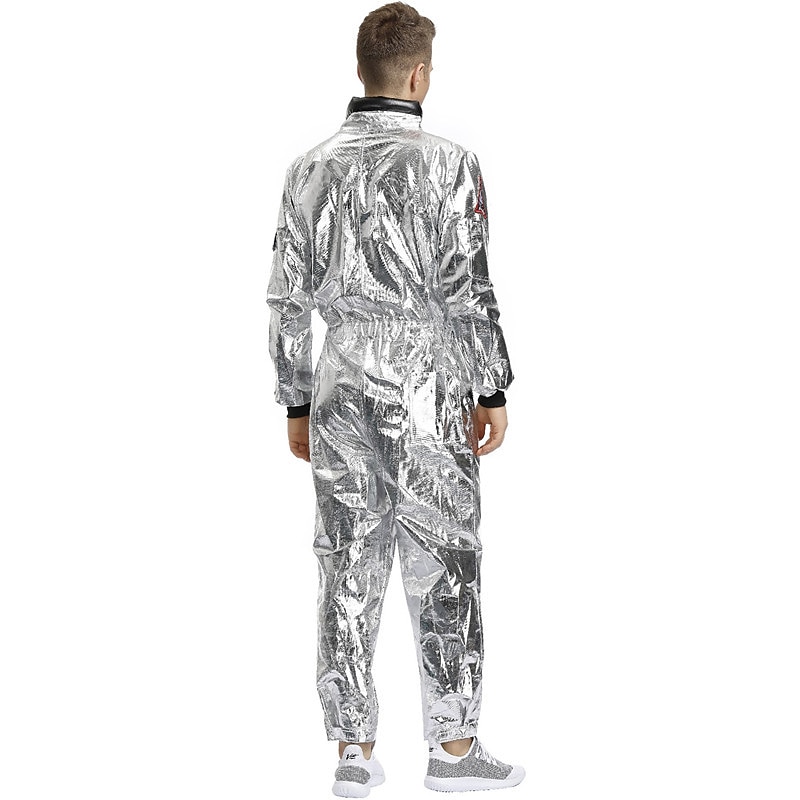 Highlights [Fabric] Crafted from high-quality polyester, this astronaut-inspired jumpsuit features a glossy, metallic silver finish that resembles a traditional space suit. The material offers comfort and durability, making it ideal for extended wear during events or costume parties. [Fit] The jumpsuit is designed with a full-length zipper at the front, allowing for easy on-and-off wear. It includes ribbed cuffs on the long sleeves for a snug fit, while the pant legs have a looser fit with elasticized ankles to ensure both comfort and flexibility in movement. [Design Highlights] Embracing a futuristic aesthetic, the jumpsuit is adorned with multiple decorative patches on the chest, giving it an authentic space explorer vibe. Black detailing and adjustable straps at the shoulders provide both contrast and added functionality to the costume. [Occasions] Perfect for Halloween, Carnival, masquerades, and Mardi Gras, this costume is a fashionable choice for any themed events or adventurous outings. Whether dressing up for a party or attending a casual gathering with a unique flair, this jumpsuit is sure to stand out. [Size] Available in sizes M, L, and XL, offering a range of options to fit various body types comfortably.