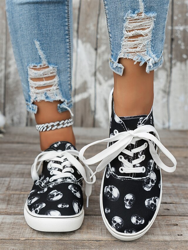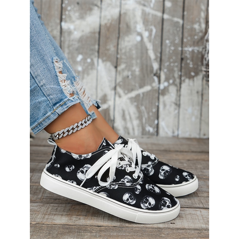 HOT ! Women's Skull Print Lace-Up Sneakers – Gothic Casual Low-Top Shoes with White Soles, Perfect for Halloween and Everyday Street Style