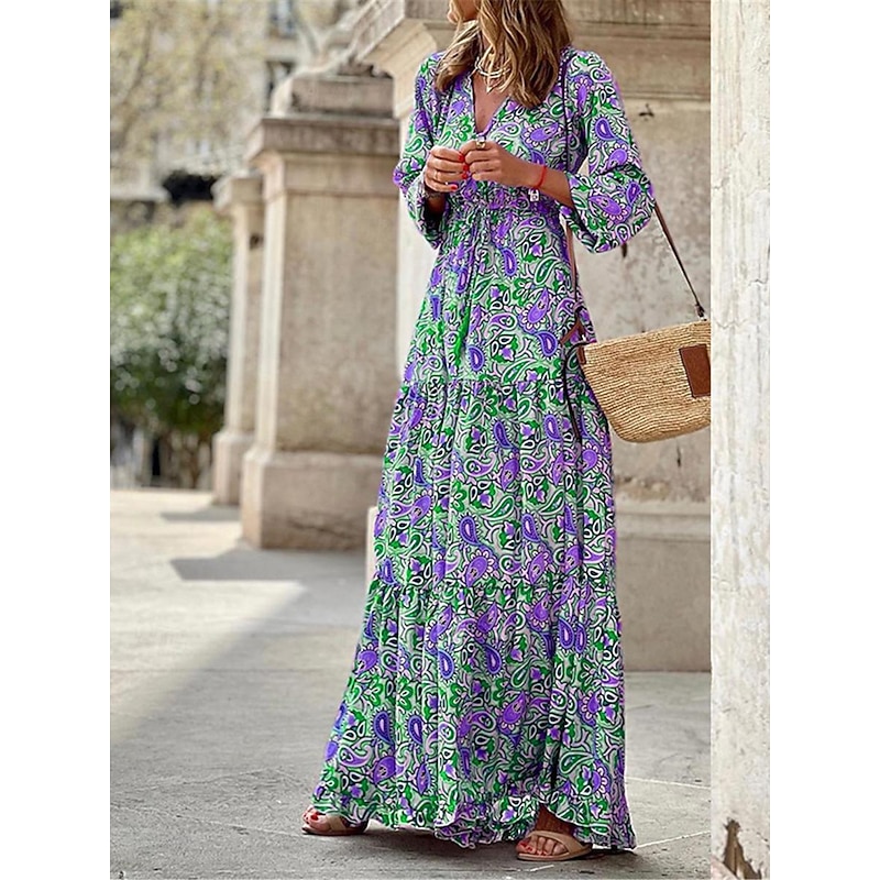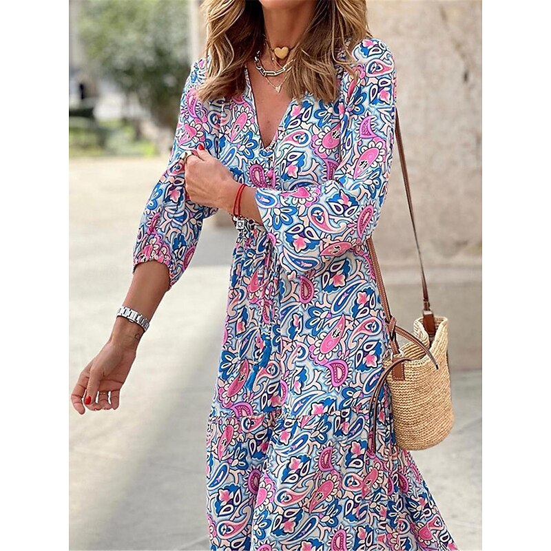 Highlights [Fabric] : Crafted from lightweight, breathable polyester, this dress offers micro-elasticity, ensuring all-day comfort and sophistication in spring and summer weather. [Silhouette] : The dress features a loose, flowing A-line silhouette with an adjustable drawstring waist, allowing for a customizable fit that elegantly enhances the figure. [Design Highlights] : This vibrant piece stands out with a colorful paisley print and a flattering V-neckline. The three-quarter sleeves and tiered skirt add volume and movement, exuding a bohemian, ethnic flair. [Occasions] : Ideal for vacations, street outings, and holidays, this dress is perfect for garden parties or seaside getaways, effortlessly combining style and ease for various casual events. [Size Range] : Available in sizes S, M, L, XL, and 2XL, catering to a diverse range of body types and ensuring the perfect fit.