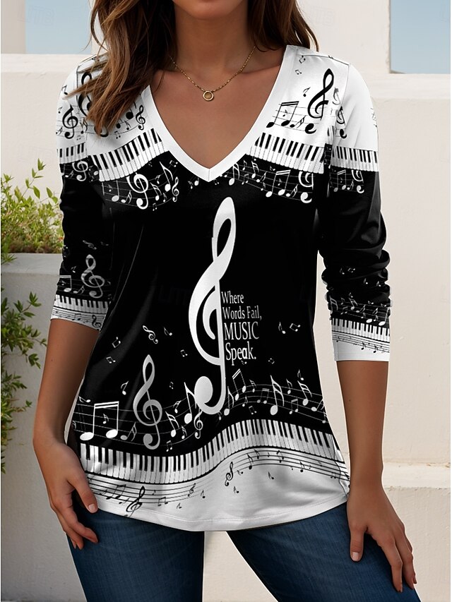 More information about Music Festival Women's T shirt Long Sleeve V Neck Long Sleeve Tunic Graphic Music Vintage Stylish Classic Regular Tops Daily Going out Weekend Print Black and White Black White Spring Fall Prefall