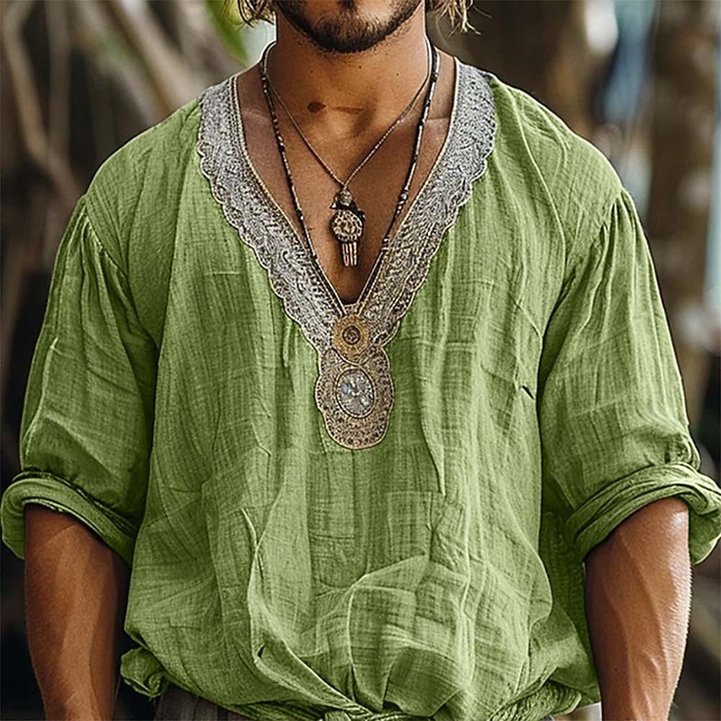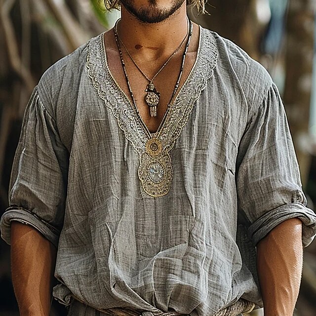 More information about Men's Shirt Linen Shirt Popover Shirt Summer Shirt Beach Wear Plain Vacation Street Green Coffee Gray Long Sleeve V Neck Summer Spring Clothing Apparel