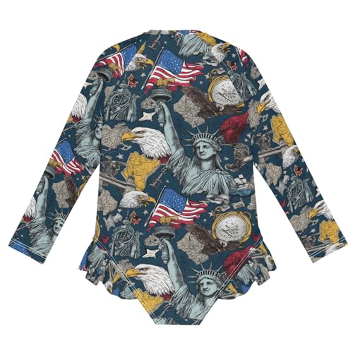 ALAZA Statue of Liberty Bird Map American Flag Girls One Piece Swimsuit Long Sleeve Rashguard Swimsuit UV 50+ Swimwear Zip 1