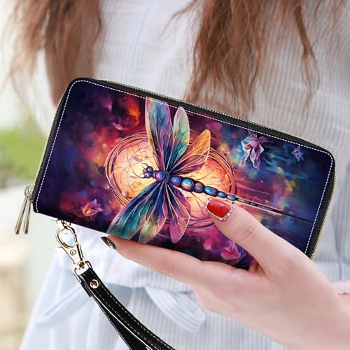 Women's Large Capacity Wallet PU Leather Double Zipper Clutch Purse Multifunctional Wallet with Removable Wristlet Strap for Smart Phone/Coin/Card/Cash, Dragonfly 1
