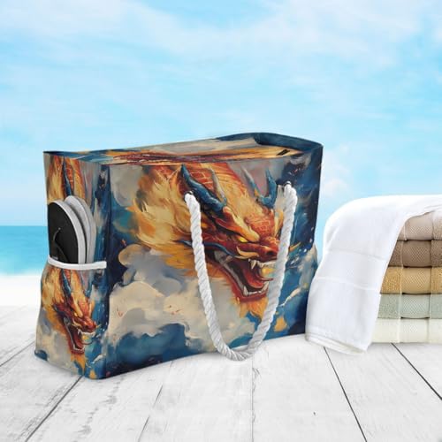 HOT ! Large Beach Bags Totes Canvas Tote Shoulder Bag Cloud Dragon Water Resistant Bags for Gym Travel Daily