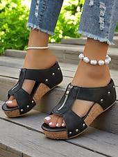 HOT ! Women's Rivet Wedge Sandals – Peep-Toe Cork Platform Shoes with Zipper Closure for Casual & Summer Wear