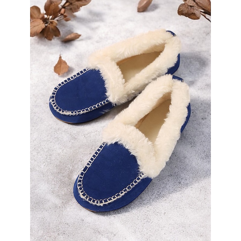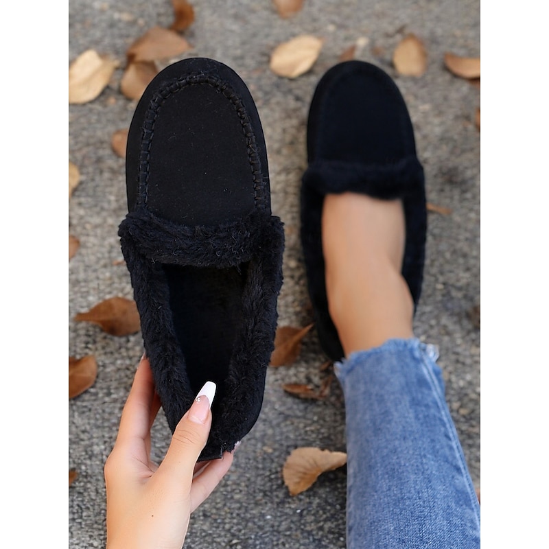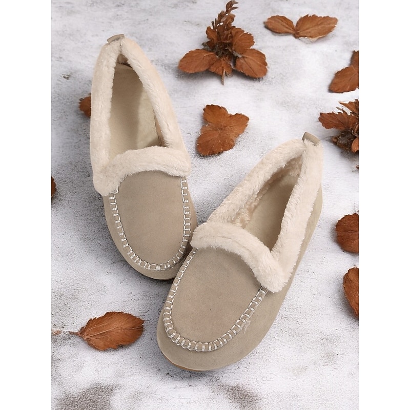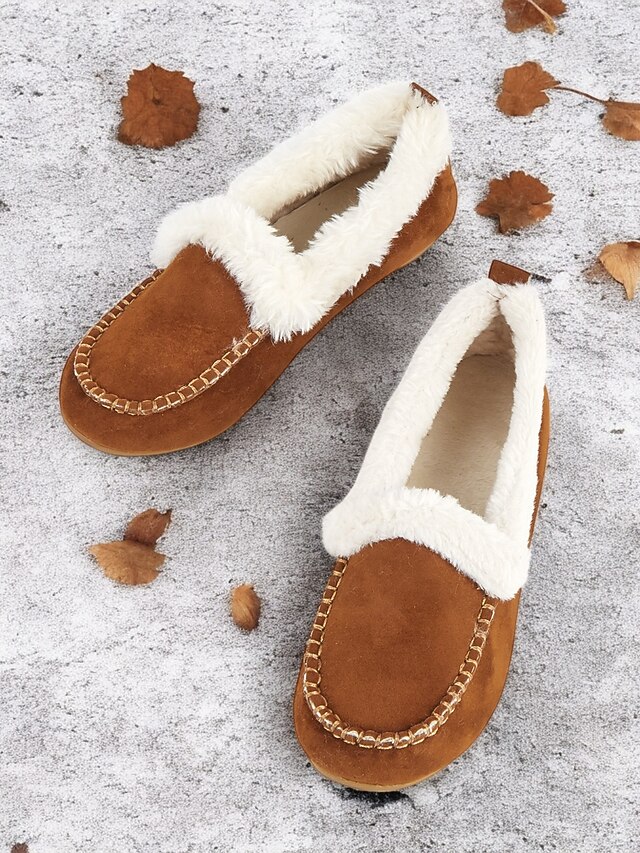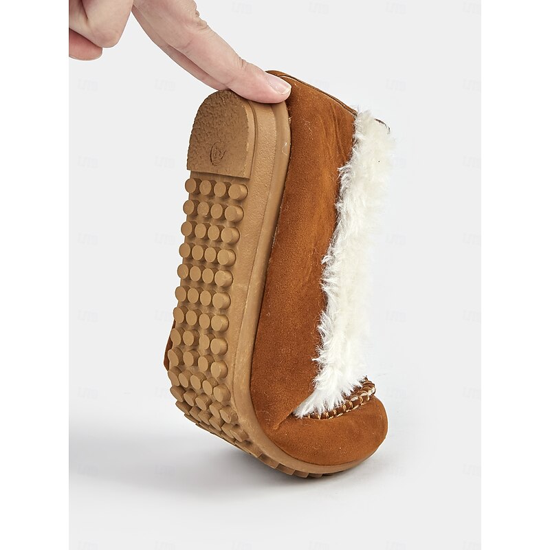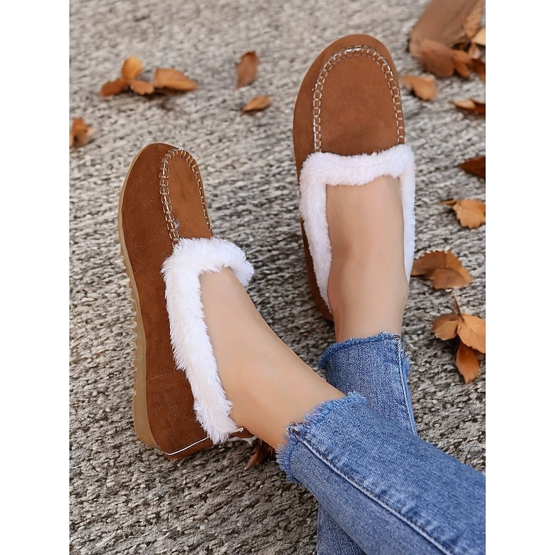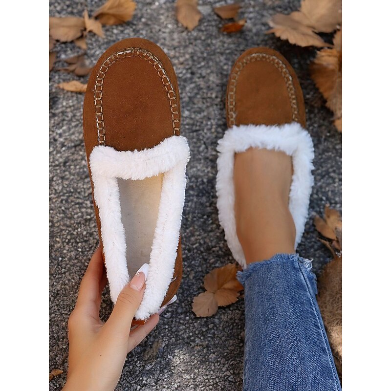 Highlights [Faux Suede Moccasin Slippers Highlights] [Fabric] : Expertly crafted from premium faux suede, these moccasin slippers offer a soft and luxurious touch. The plush faux fur lining ensures warmth and comfort, making them an excellent choice for cold weather wear. [Fit] : Designed with a cozy slip-on style, these slippers promise a relaxed fit, suitable for lounging in comfort. The classic round toe shape adds to their casual and comfortable appeal, making them perfect for daily wear. [Design Details] : The slippers feature traditional whipstitch detailing around the toe area, adding a touch of classic charm. The rich brown color pairs beautifully with the white faux fur lining, resulting in a sophisticated and timeless aesthetic. [Occasions] : Perfect for indoor wear, these slippers are ideal for relaxing at home. Whether you're enjoying a lazy weekend or winding down after a long day, they deliver a combination of warmth and style. [Size Range] : Available in a variety of sizes, these slippers cater to a wide fit range from US5.5 to US10.5, ensuring the perfect fit for every wearer. The detailed size chart provided aids in selecting the optimal size for comfort and style.