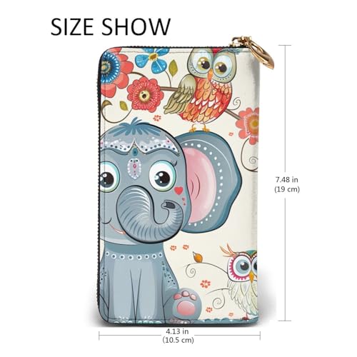 Cartoon Elephant and Owls Floral Printed Long Wallet for Women Men Cute PU Leather Wallet with Coin Purse and Credit Card Holder 1