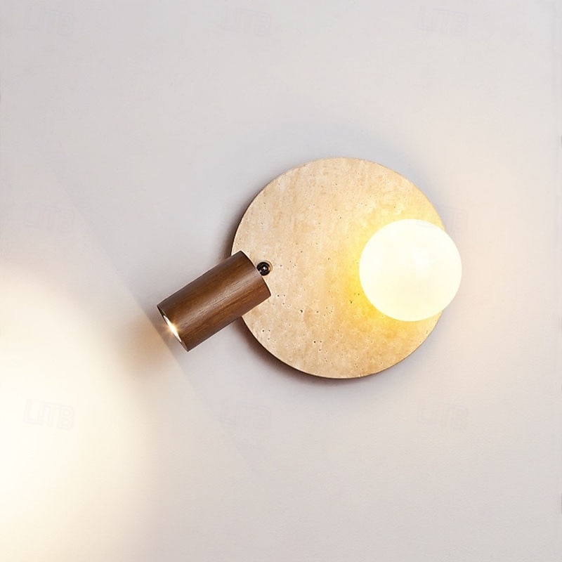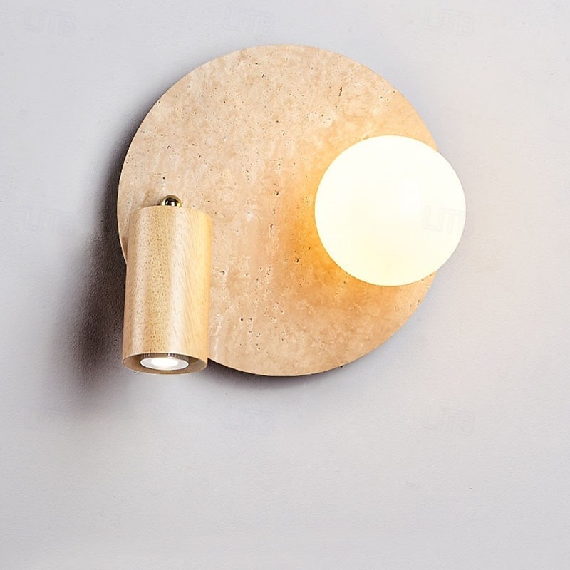 HOT ! Modern Yellow Travertine Wall Sconce Rotatable Wood Wall Lamp with Milk White Glass Shade Wabi Sabi Round Indoor Wall Sconces Adjustable Bedside Reading Light for Bedroom 110-240V 10W