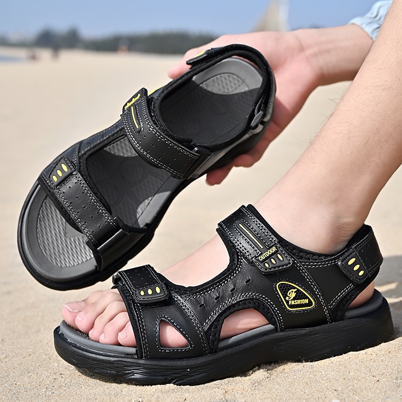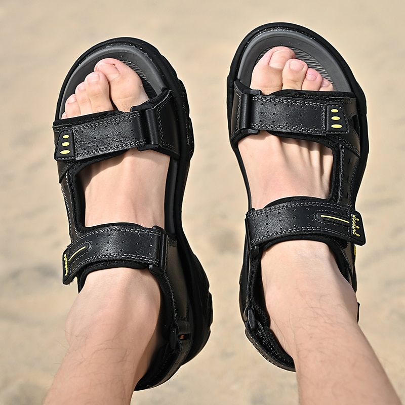 Highlights [Fabric and Material] : Crafted from high-quality Nappa leather, these men's sandals offer a luxurious feel and enhanced durability, making them ideal for everyday wear. The upper material is designed to withstand the rigors of outdoor activities while providing maximum comfort. [Design and Fit] : With a casual style and a round toe shape, these sandals feature a hollow-out embellishment that ensures breathability, perfect for spring and summer. The sandals are equipped with adjustable Magic Tape closures, allowing for a customized and secure fit that is easy to adjust. [Design Highlights] : The open-toe and open-heel design not only promotes airflow but also adds a modern touch to the classic silhouette. The non-slip rubber outsole provides excellent traction, offering stability on various surfaces, making them a reliable choice for active use. [Occasions] : These versatile sandals are perfect for a range of activities including daily walking, beach outings, and casual hiking. They combine functionality with style, making them an excellent choice for both leisurely strolls and more adventurous pursuits. [Size Range] : Available in sizes ranging from EU 38 to EU 46, these sandals cater to a broad spectrum of foot sizes, ensuring a comfortable fit for most wearers.