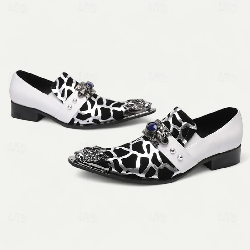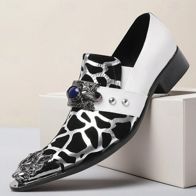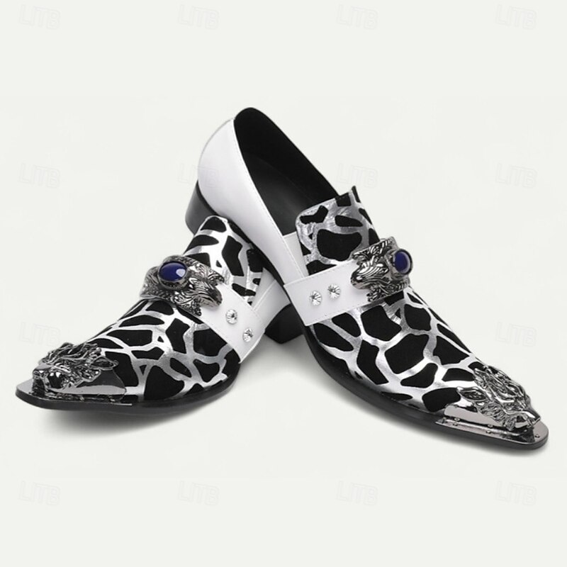 HOT ! Men's Black and White Cow Print Slip-On Dress Shoes – Statement Western Loafers with Jewel Buckle for Concerts, Parties and Costumes