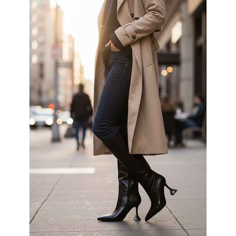Women's Black Crocodile Pattern Knee High Boots, Genuine Leather Pointed Toe Stiletto Heel Boots, Urban Fashion Style for Women, Perfect for City Chic and Stylish Outfits 17