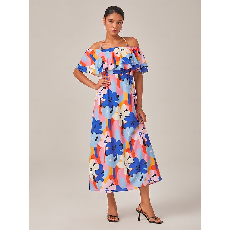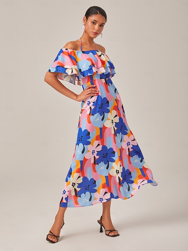 Abstract floral pattern, one-shouldered, frilled hem, elegant long dress style. 5
