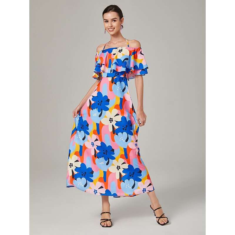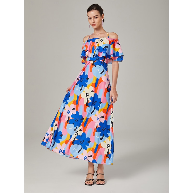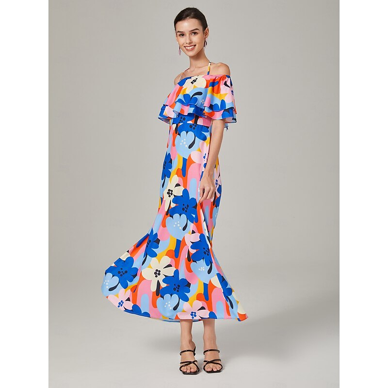HOT ! Abstract floral pattern, one-shouldered, frilled hem, elegant long dress style.