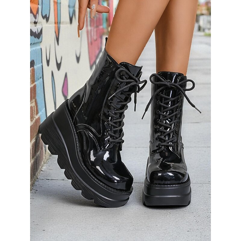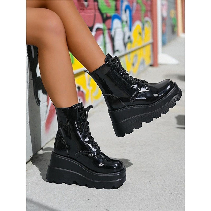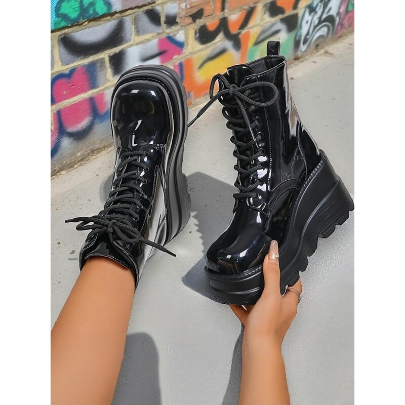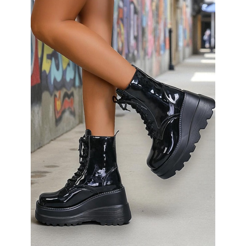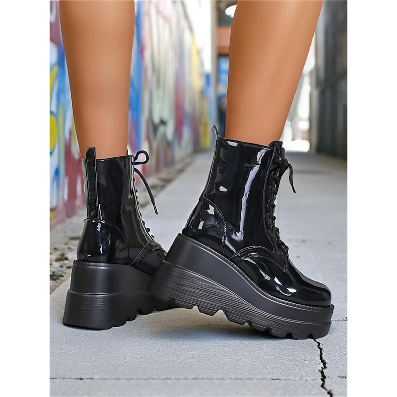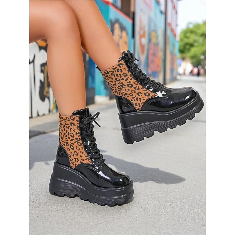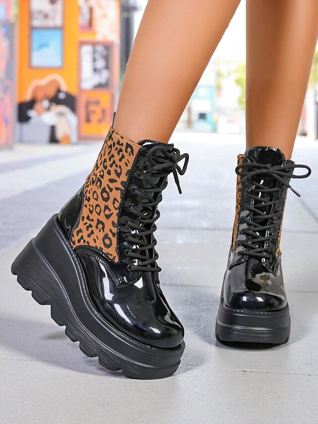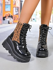 HOT ! Women's Black Patent Leather Platform Ankle Boots with Leopard Print Panel, Chunky Lace-Up Combat Style Fashion Boots for Streetwear & Night Out