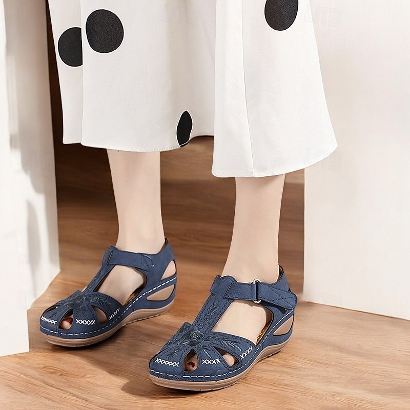 Highlights [Fabric and Materials]: These women's casual sandals are crafted from high-quality faux leather, offering a chic and durable design. The upper material features an elegant embroidered cut-out design in a refined navy blue with intricate white stitching details, providing a stylish and breathable look for summer wear. [Fit and Style]: Designed with a comfortable wedge heel, these sandals feature a closed-toe and a round shape that ensures easy and relaxed wear. The adjustable Velcro strap, also known as a magic tape closure, allows a customizable fit, catering to different foot shapes for an all-day comfortable experience. [Design Highlights]: These sandals come with decorative cutouts and subtle embroidery that enhance their aesthetic appeal, providing both elegance and a unique style twist. Lightweight and durable rubber soles ensure excellent traction and stability, making them a dependable choice for various activities. [Occasions]: Ideal for daily wear, these versatile navy blue sandals are perfect for outdoor settings, beach outings, and casual summer occasions. Whether you're headed to a beach day or running errands around town, these sandals complement a variety of casual and elegant styles. [Size Options]: Available in a wide range of sizes from 36 to 43, these sandals are designed to accommodate various foot sizes, ensuring a comfortable fit for every wearer.