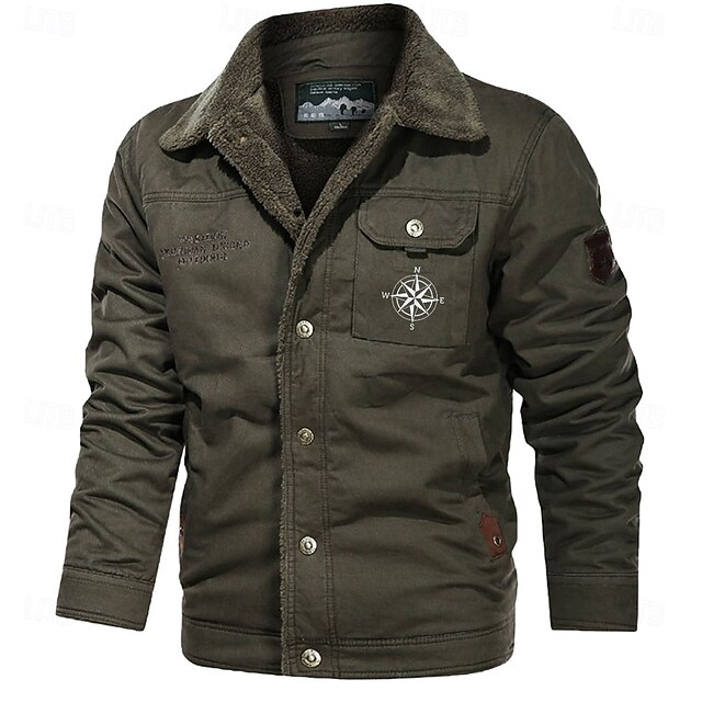 More information about Men's Compass Print Embroidered Fleece Jacket Sherpa Trucker Jacket Work Cargo Jacket Turn-Down Collar Warm Winter Cotton Jacket Vintage Casual Going Out Coat Multi-Pockets