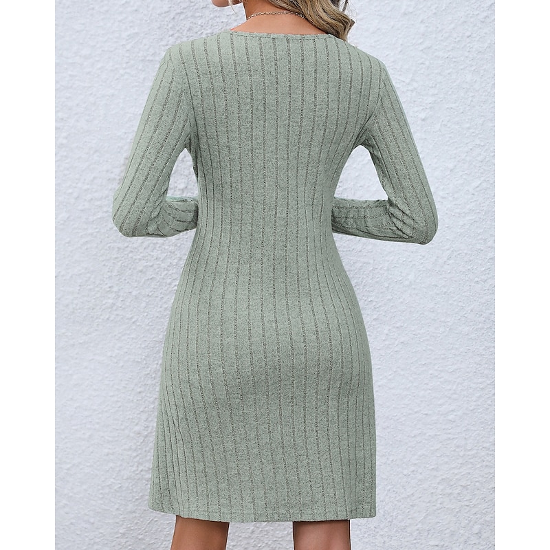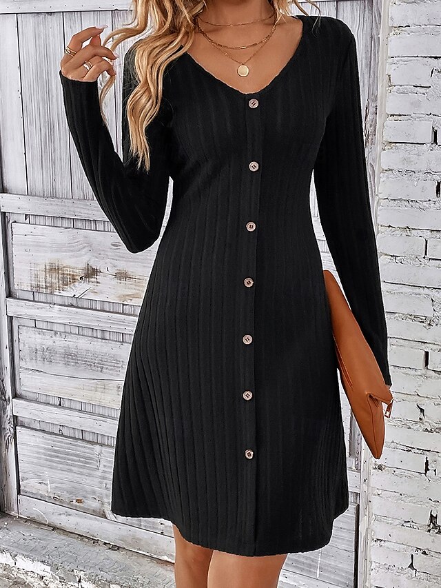 Highlights [Fabric] This exquisite little black dress is crafted from a soft, knit fabric that provides both comfort and durability. The polyester material features a micro-elastic quality, ensuring a perfect fit that adapts to the wearer's movements. [Silhouette] With a flattering A-line silhouette, this dress enhances the figure and exudes a feminine charm. Its regular fit offers ease of movement while maintaining a tailored appearance. [Design Highlights] The dress showcases a sophisticated V-neckline and long sleeves, offering a polished and modern aesthetic. The front is embellished with a row of buttons, imparting a hint of vintage elegance. The dress's plain pattern and ribbed texture add a layer of style and sophistication. [Occasions] Ideal for a range of occasions, this versatile dress can be worn to both casual outings and more formal events. Whether it’s for work fashion, an evening gathering, or a weekend brunch, this dress adds a touch of elegance and style to any setting. [Size Range] Available in a variety of sizes, including S, M, L, XL, and 2XL, this dress ensures a stylish fit for a range of body types. Choose the size that suits you best for the perfect combination of comfort and chic appeal.