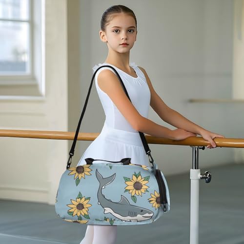 Duffle Bag Kids Gym Bag with Shoes Compartment & Wet Separation Overnight Travel Duffel Bag Shark and Sunflower for Girl Boy 1