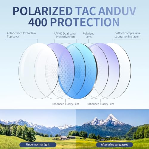 • 🕶️ Premium Polarized Lenses: Equipped with high-quality polarized lenses that eliminate glare, reduce eye fatigue, and enhance color clarity for safer driving, hiking, fishing, or beach activities.