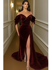 More information about Burgundy Stretch Velvet Evening Gown Elegant Dress Formal Wedding Sweep / Brush Train Sleeveless Off Shoulder Sequined with Pleats 2025