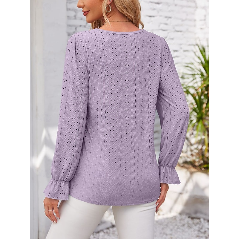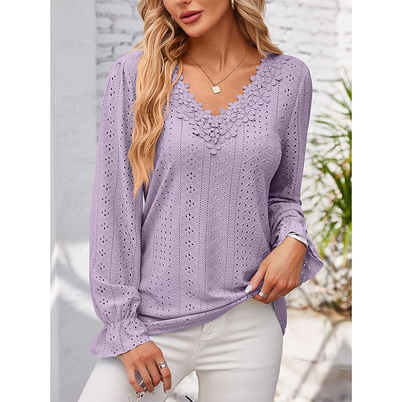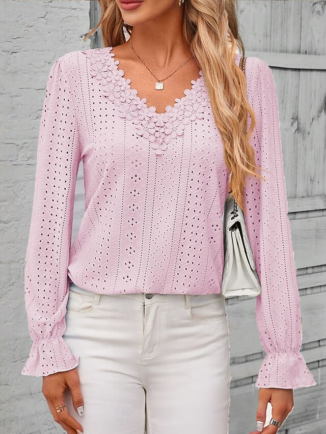 More information about Women's Elegant Lace Tops Eyelet Blouse Solid Color Lace Eyelet Flutter Sleeve Long Sleeve Regular Tops V Neck Daily Romantic Petite Tops Summer Holiday Wear Pink Blue Purple Green Spring Fall